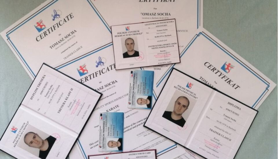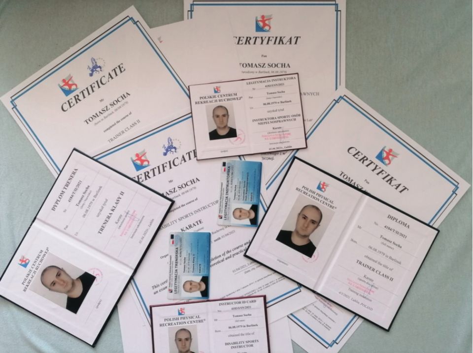 Sensei Tomasz Socha, aby móc pomagać w treningach Karate osobom niepełnosprawnym, zwłaszcza tym, których blokada psychiczno-fizyczna nie pozwala na samodzielne działania, ukończył dwa kursy uzyskując tytuły: